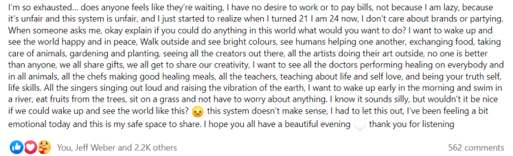 - We would each take care of each other without losing ourselves in the process. Our children would be protected from the monsters of the world and would be safe being themselves. Our elders would be honored and treated with dignity and love. And those of us in the middle wouldn’t be dreaming of a retirement that we can’t afford anyway. We would do what we love, earn more than a living wage without being burned out by corporations that put profit before people.