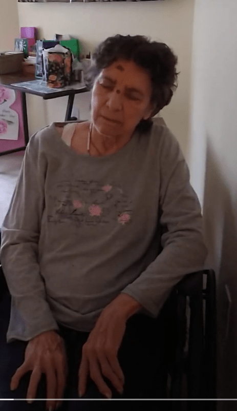 - This person is in a wheelchair and can not hold herself up.