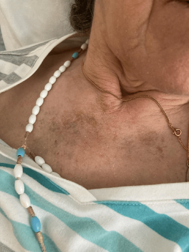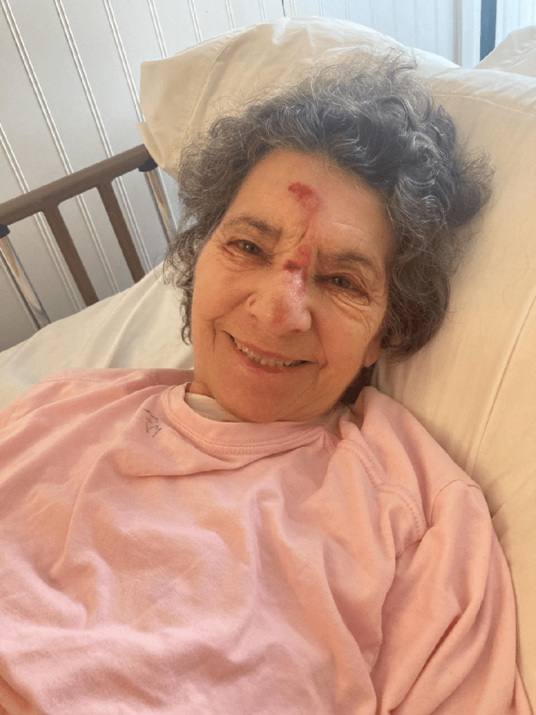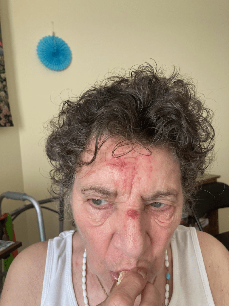 According to the DSS findings, the facility reported falls on 3/9, 3/10 (transported to hospital 3/11 and moved to rehab through 3/29), 4/22, 5/17, 5/17-18, 6/20, (6/24 NOT REPORTED – see photo below of injuries to her face) they also told me she started vomiting on the 6/25 – NOT REPORTED), 7/28, 9/15 (they found her on the floor of the activities room), 9/23 (left her at bathroom sink where she tried to stand up – unattended – and wash her hands. 10/15 NOT REPORTED, nor was Hospice or I notified in a timely manner (hours). 10/30 NOT REPORTED. 11/16 – NOT REPORTED. 12/7 – NOT REPORTED. Just found a few more based on my Facebook posts that were NOT REPORTED. See below.