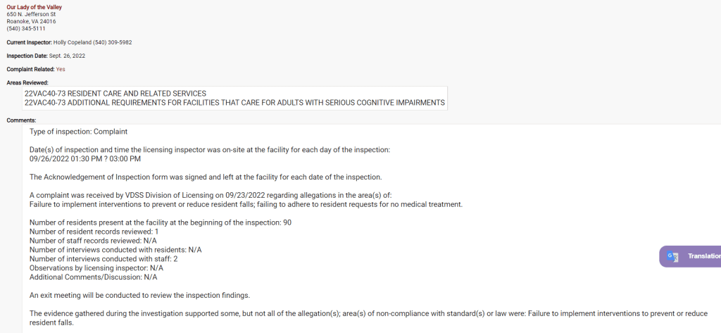 Here’s the DSS report I just received a few weeks ago which is public information if you want to search for it. I can’t provide a direct link so click on the link below and search for Our Lady of the Valley.
