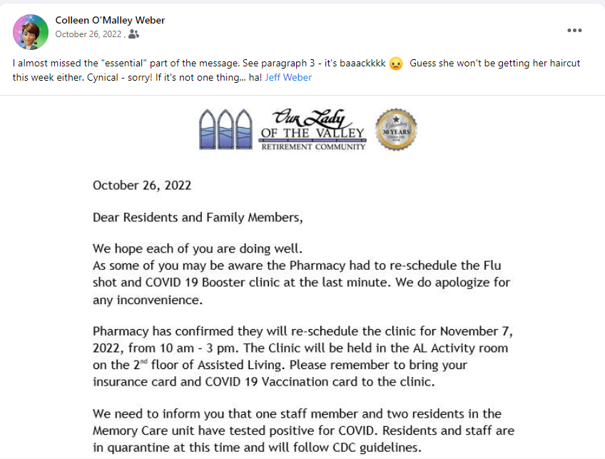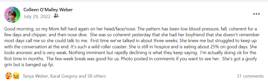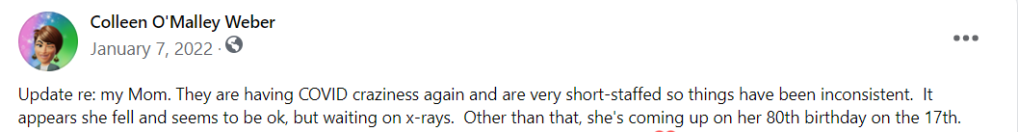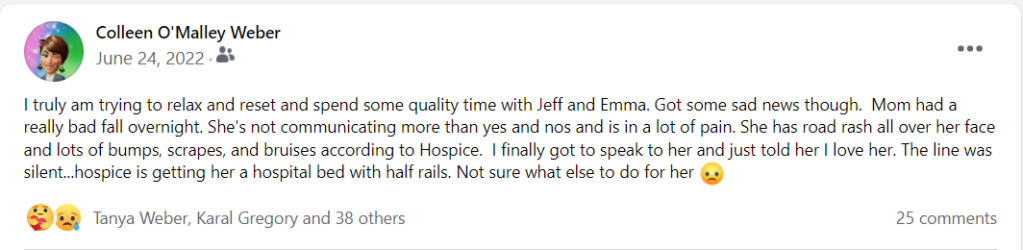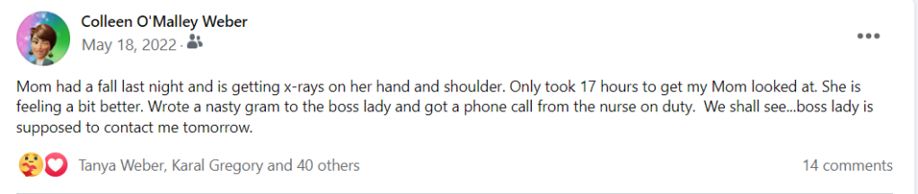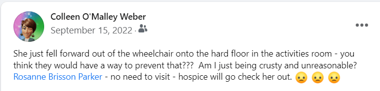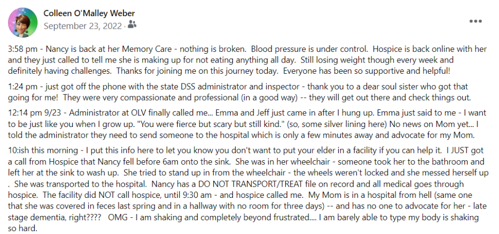 Here’s another kicker — on 9/23/22 she was sent out to the hospital, despite orders not to given her Do Not Transport and Hospice situation. She was sent without any ‘advocate’ despite her not being able to remember anything, communicate, or make decisions. Spoke with the administrator at the facility and I was told:
